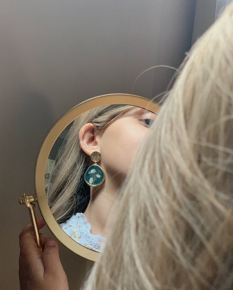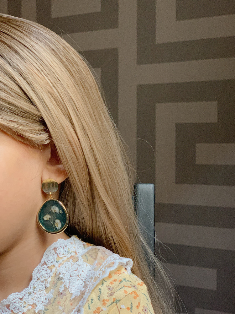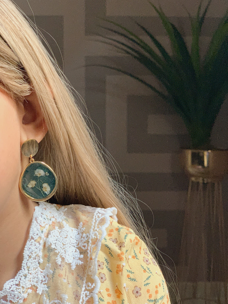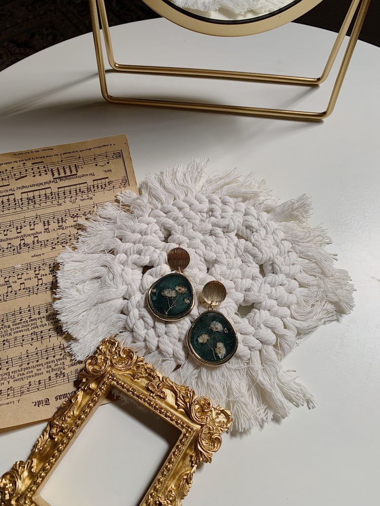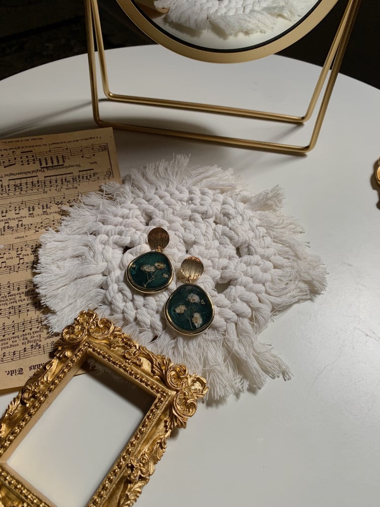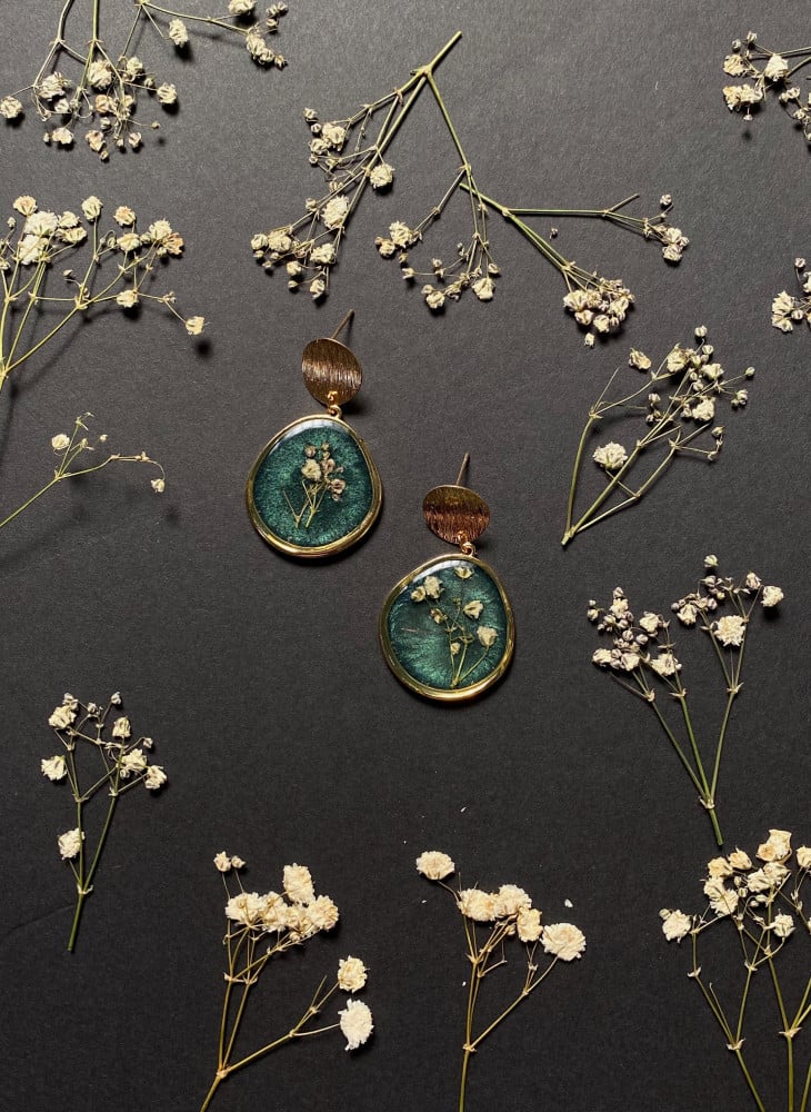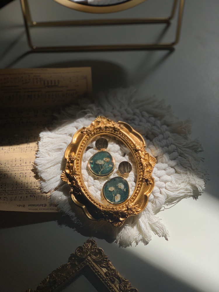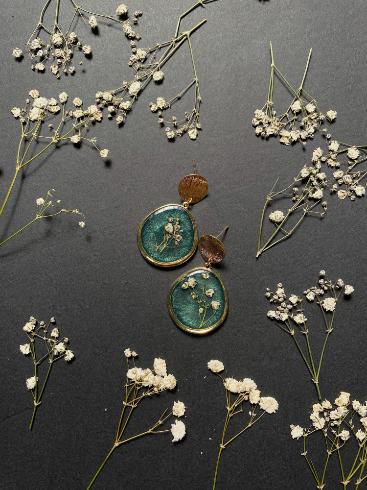 مصنوعة يدويًا بعناية فائقة، حيث تحتضن طبقات شفافة من الراتنج زهورًا صفراء حقيقية، منها زهور الأقحوان الرقيقة وأزهار البرية الصغيرة، إلى جانب أوراق خضراء متناثرة كأنها رقصة خفيفة من الطبيعة داخل تصميم فاخر. يبدو كل عنصر داخلها وكأنه عالق في لحظة أبدية، يحافظ على بهائه دون أن يذبل.
