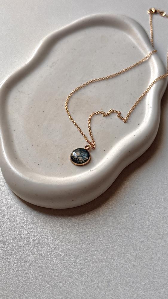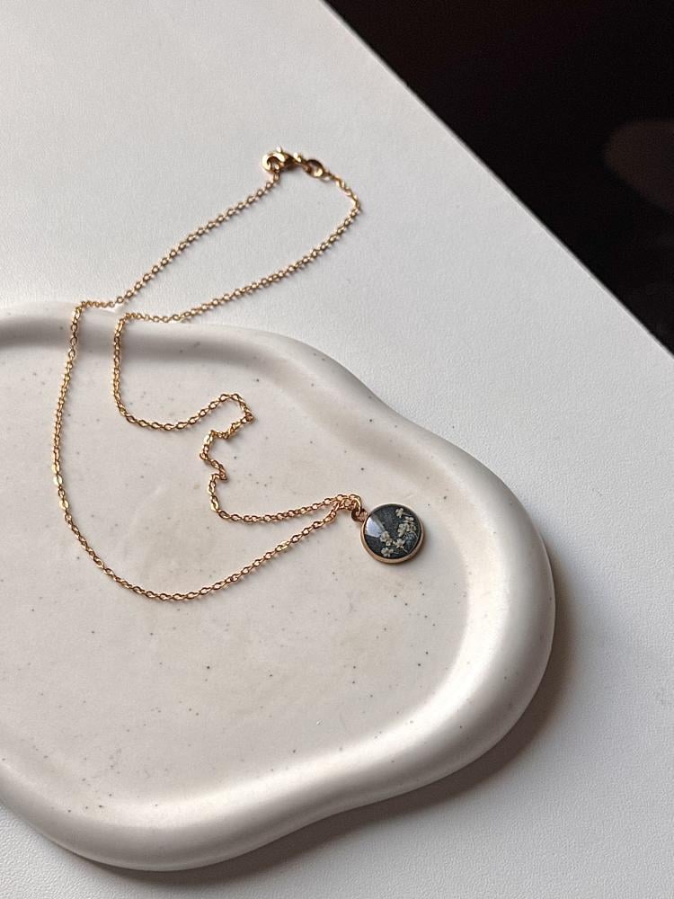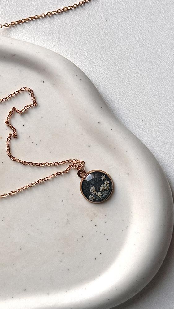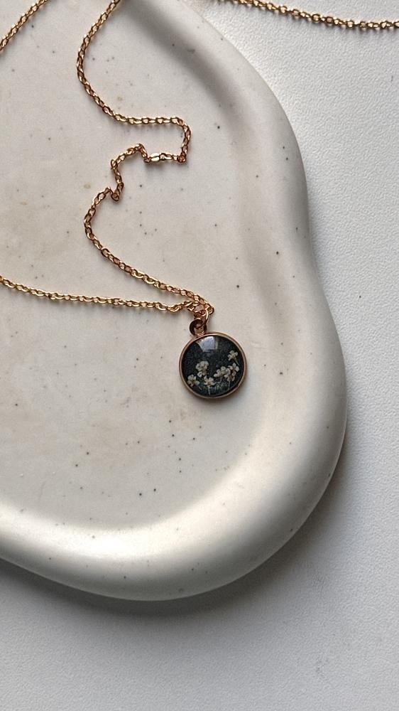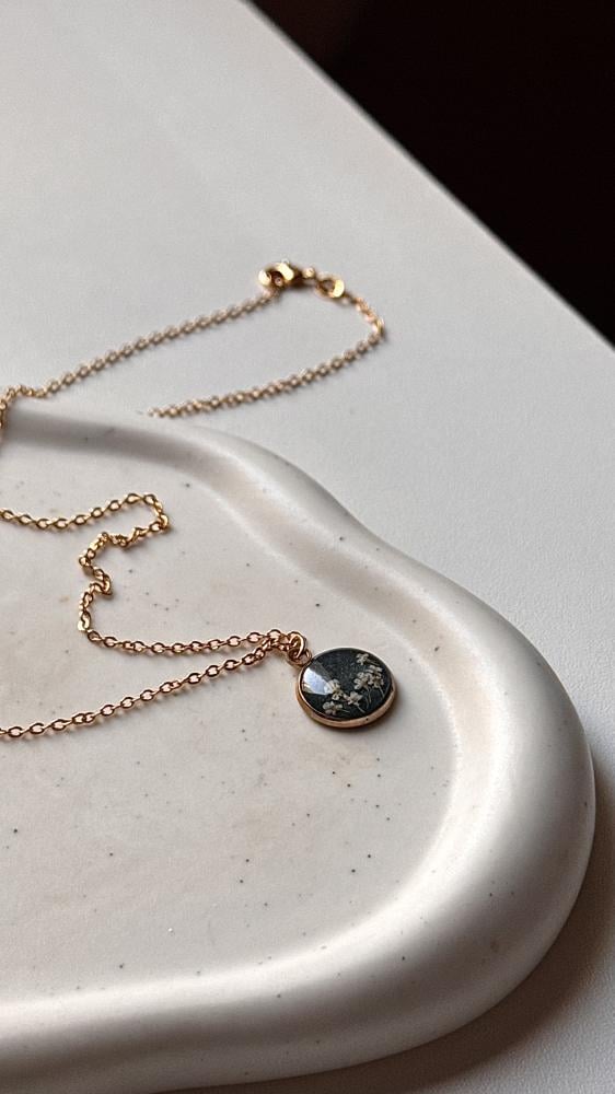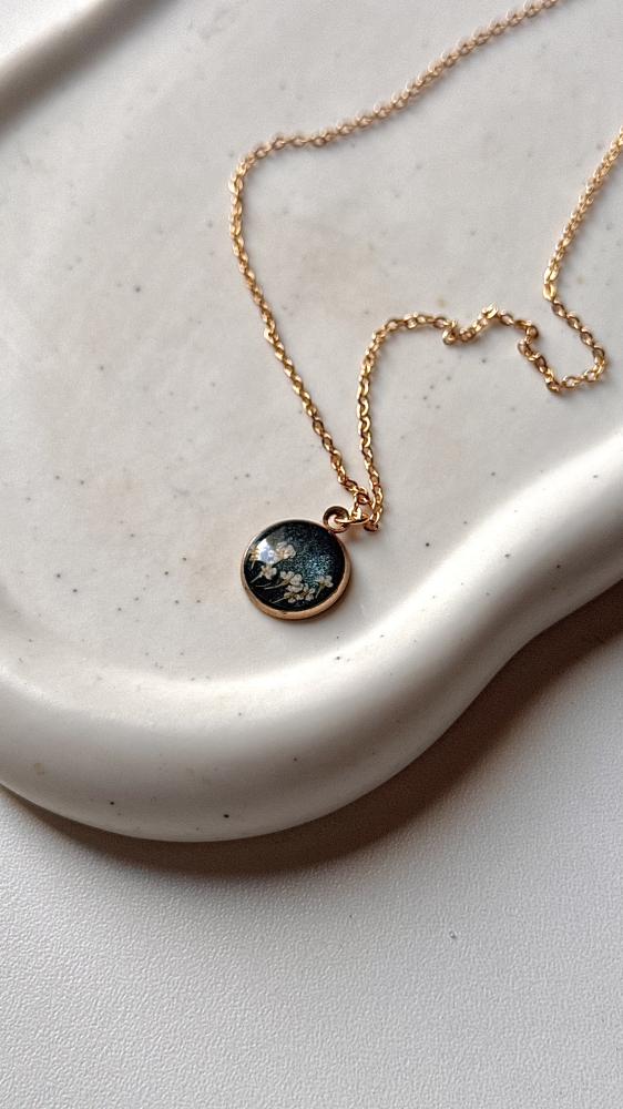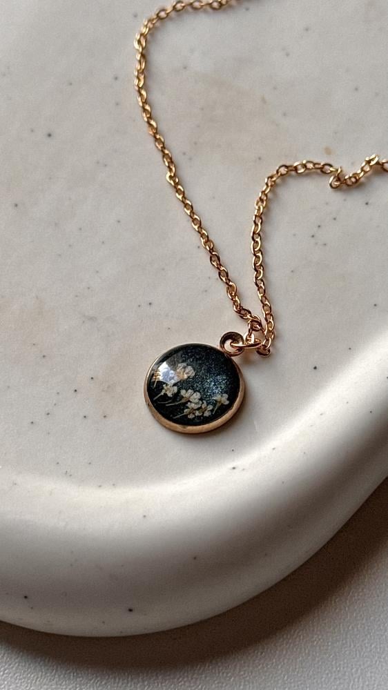 القلادة مغلفة بطبقة شفافة تحافظ على الزهور المجففة بحالتها الطبيعية، ومثبتة بإطار دائري بلون ذهبي دافئ على سلسلة أنيقة تضيف لمسة أنثوية ناعمة لأي إطلالة.