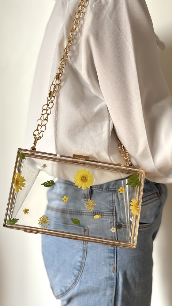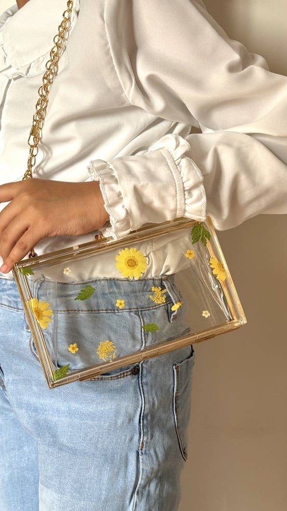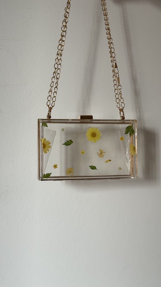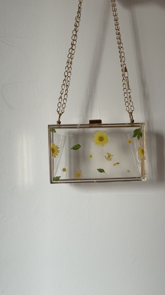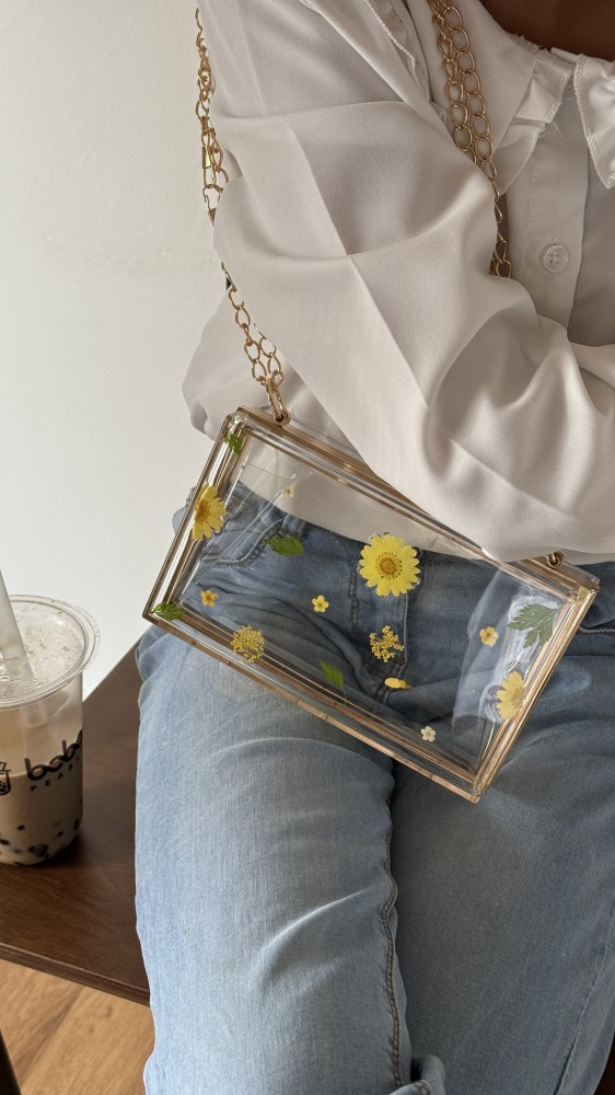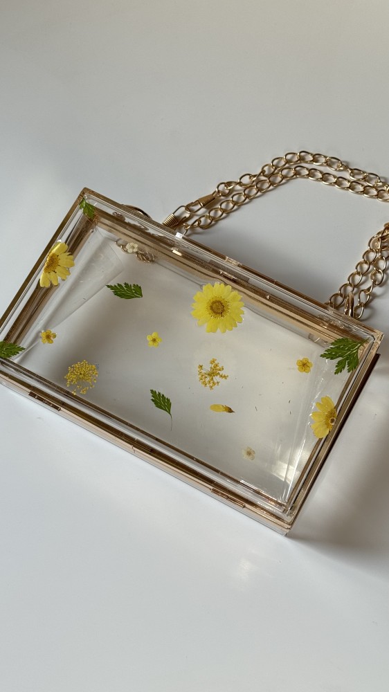 مصنوعة يدويًا بعناية فائقة، حيث تحتضن طبقات شفافة من الراتنج زهورًا صفراء حقيقية، منها زهور الأقحوان الرقيقة وأزهار البرية الصغيرة، إلى جانب أوراق خضراء متناثرة كأنها رقصة خفيفة من الطبيعة داخل تصميم فاخر. يبدو كل عنصر داخلها وكأنه عالق في لحظة أبدية، يحافظ على بهائه دون أن يذبل.