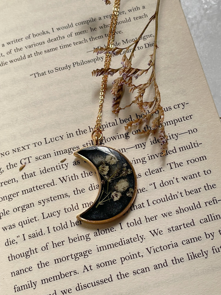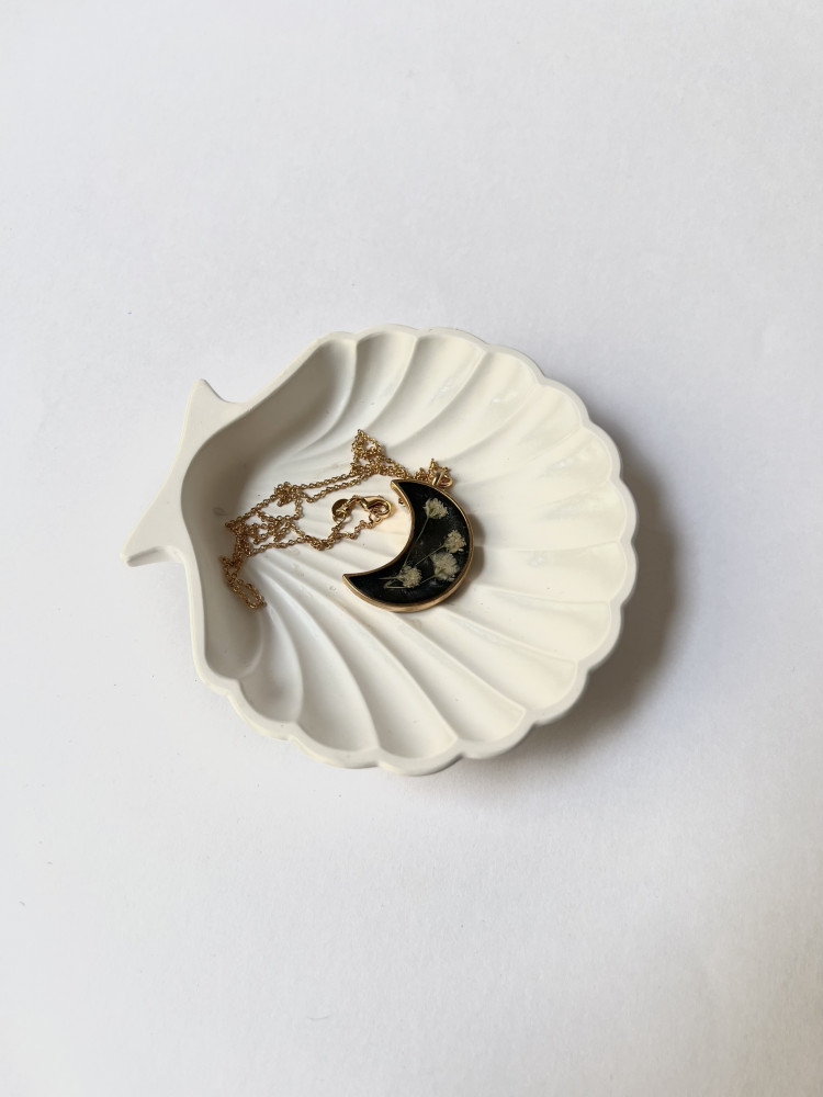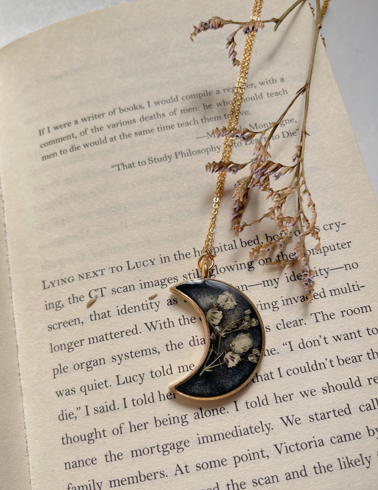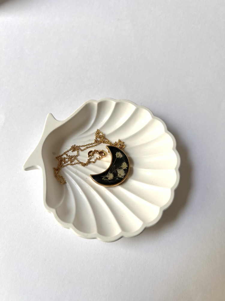 هذا العقد المميز يأتي بتصميم هلالي راقٍ، يحتوي على زهور الجبسوفيليا الحقيقية المحفوظة بعناية داخل مادة شفافة تمنحها مظهراً أنيقاً وساحراً. الإطار الذهبي الناعم يعزز من فخامة التصميم، مما يجعله قطعة فريدة تعكس الجمال الطبيعي والرمزية العميقة.